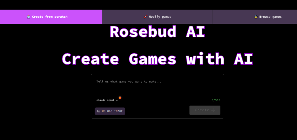 | Rosebud AI | Text-to-game creation | See site | No | Playable prototype generator |