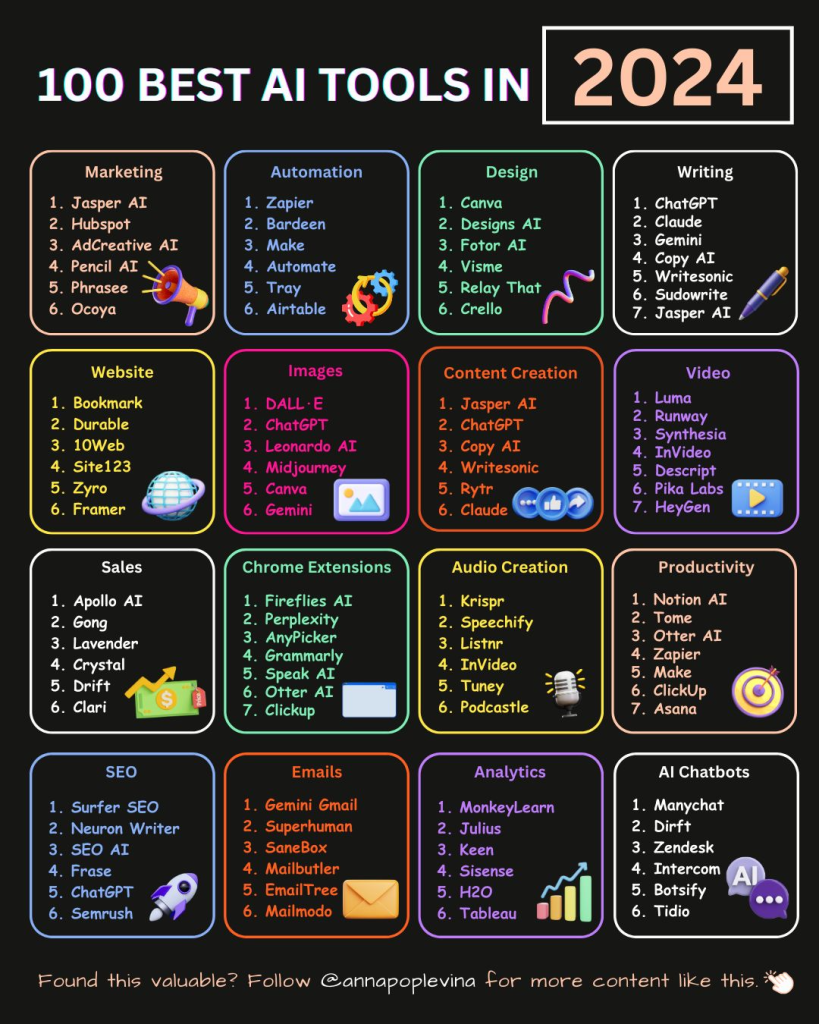 - Notion AI, Tome, Perplexity, Krispr, ClickUp – Organize, brainstorm, and manage projects like a boss.