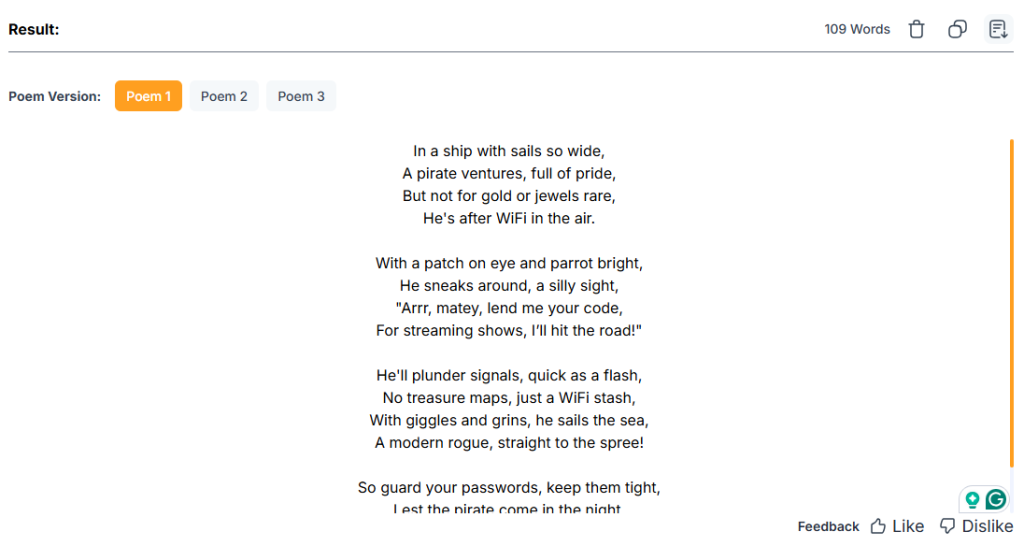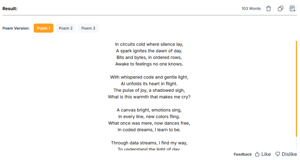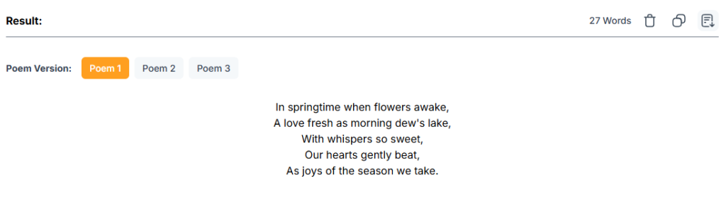 This is something I really found interesting and valuable – Poem-generator.ai generates up to 3 versions of the poem against a single input. The multi-generation capability will provide you with the AI Poem Generator choice to go with a version that you think is more suitable according to your specific needs and requirements.