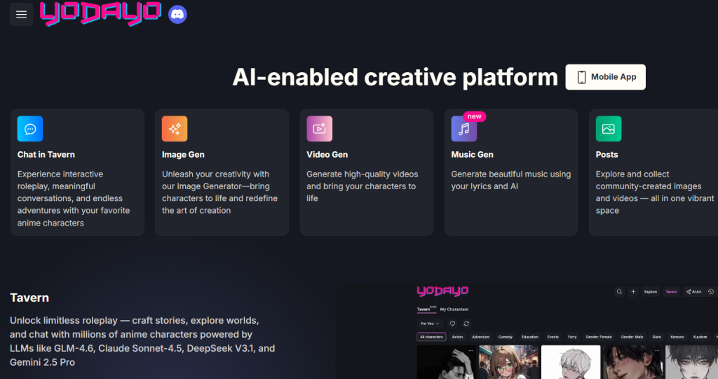 What it is: A specialized AI anime generator or creation platform with image, video, and sticker generation capabilities.