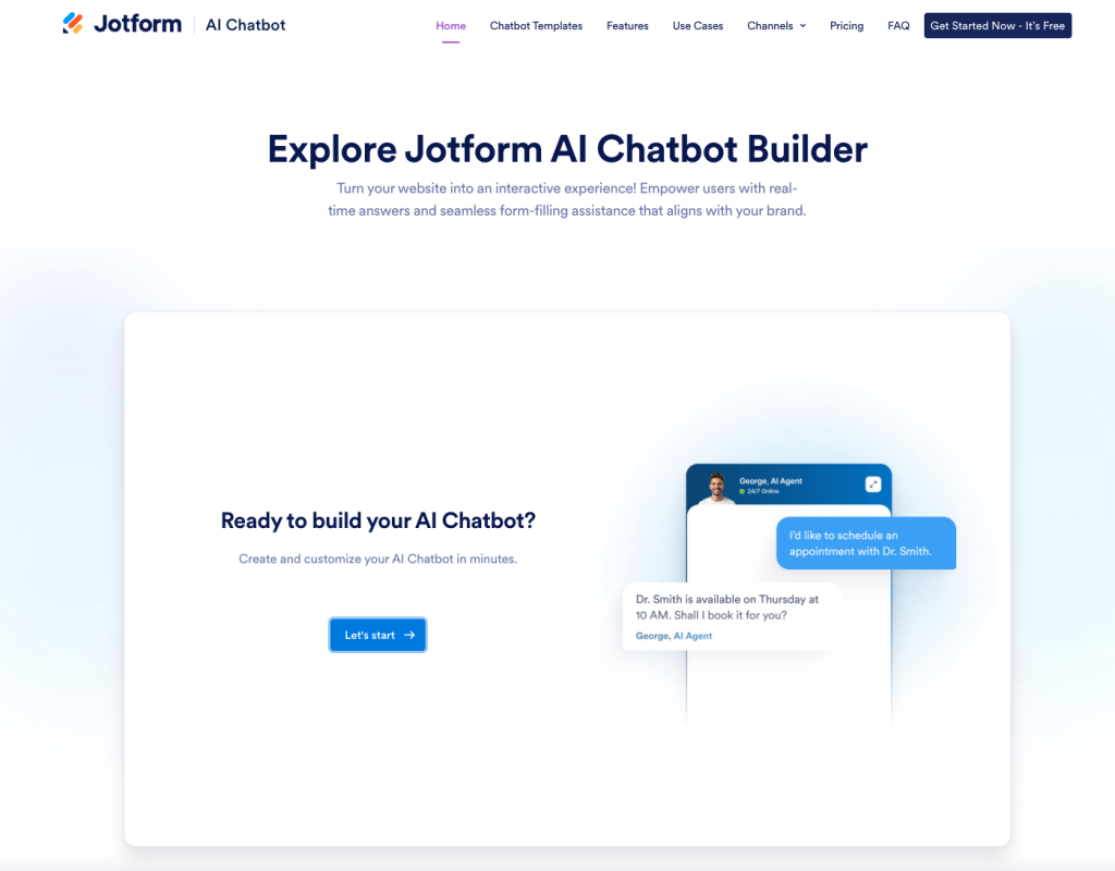 Jotform’s AI Chatbot Builder lets you turn any website into an interactive conversational experience without any coding. It combines form logic, FAQ answering, and branded design to deliver real-time user support, help visitors fill out forms conversationally, and reduce friction in user interactions. The chatbot can be trained with your own data and styled to feel like a native part of your site.
