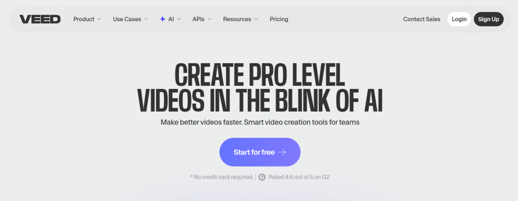 | Veed.io | Social-ready editing | $18/month | Yes | AI captions |