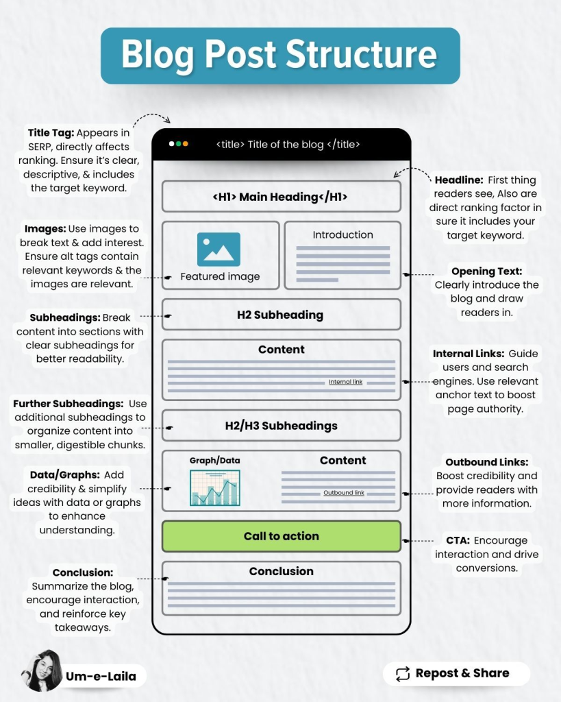 The best blog post structure includes a keyword-rich title tag, engaging headline, compelling introduction, featured image, clear H2–H4 subheadings, supporting data/visuals, and strategic internal links. This setup makes posts easier to read, improves SEO rankings, and keeps readers engaged from start to finish.