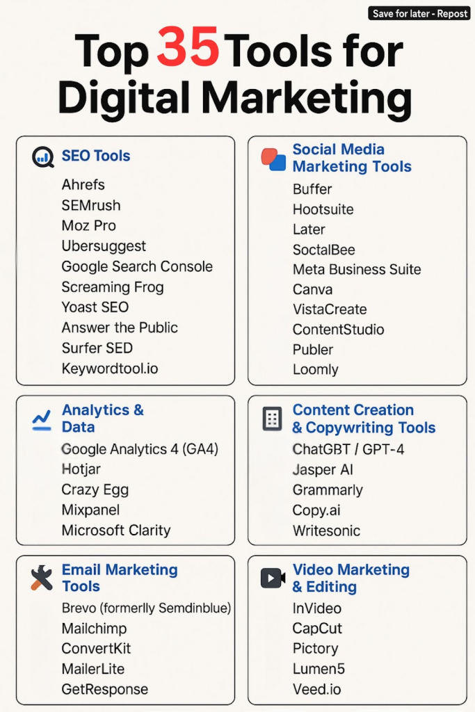That’s why I’ve rounded up 35 of the best digital marketing tools for 2025. From SEO powerhouses to social media lifesavers, these are the platforms I’d recommend to marketers, creators, and business owners who want more clicks, conversions, and calm.