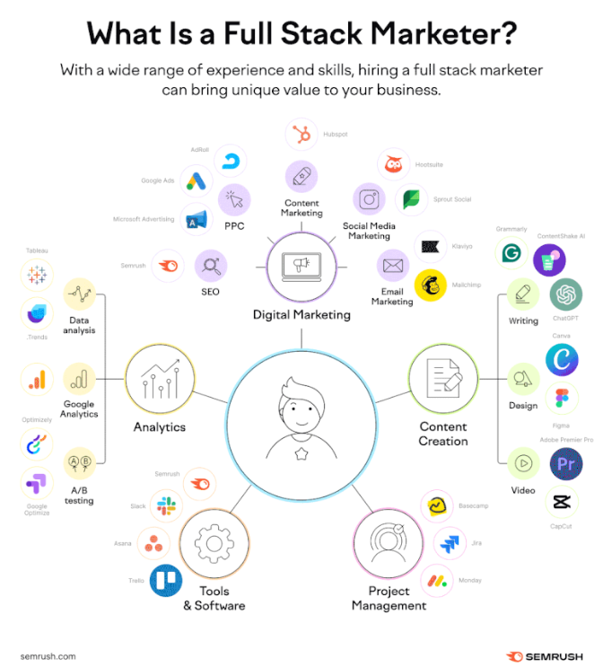 A marketer with typically a “full-stack” approach can work effectively across many different disciplines, such as email, SEO, and paid advertising, rather than mastering just one.