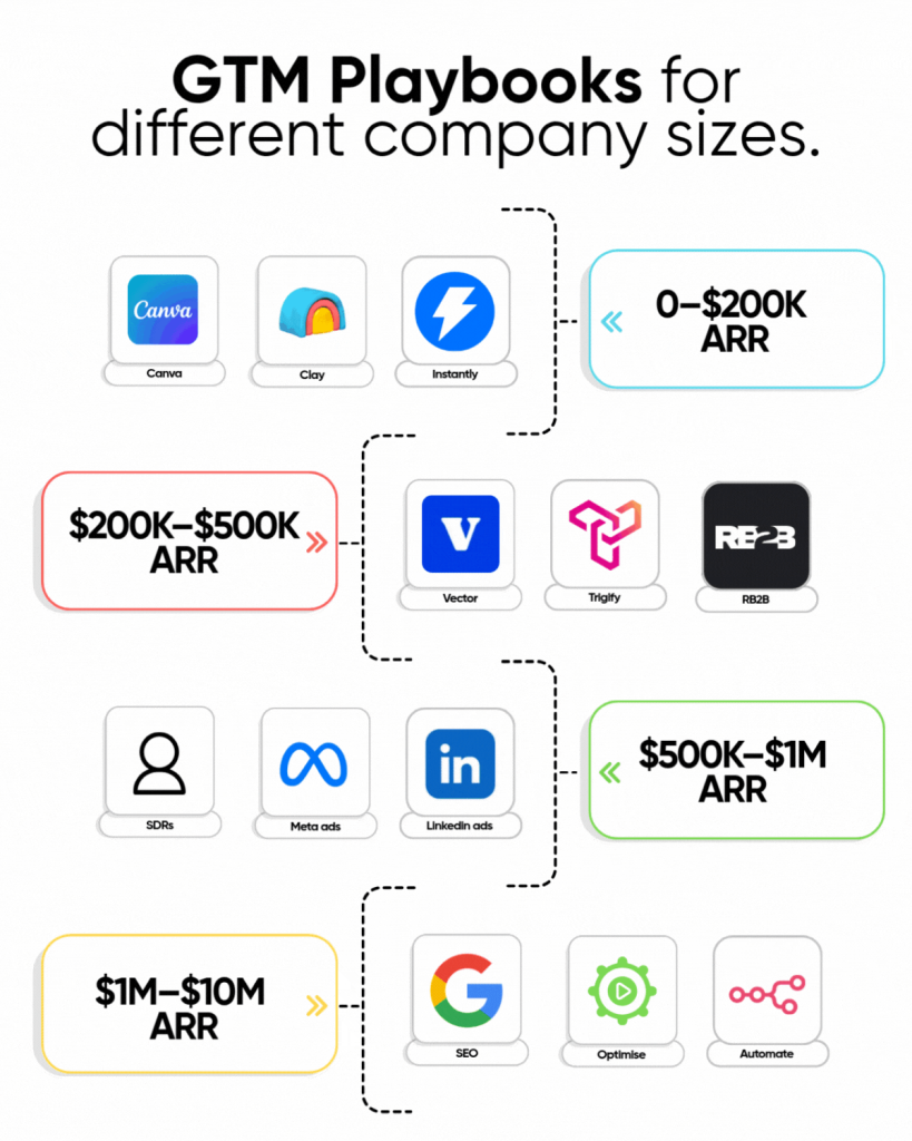 A GTM playbook is a stage-specific strategy for how your company acquires, converts, and retains customers. From $0–$200K ARR, focus on testing and founder-led outreach. At $200K–$500K ARR, amplify what works with light paid ads.