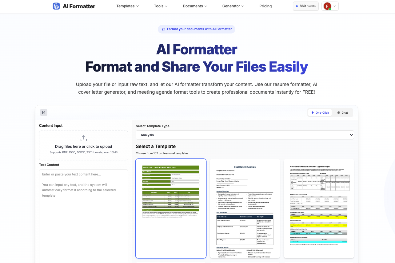 AI Formatter is a cutting-edge AI-powered document formatting platform that revolutionizes how professionals, job seekers, and businesses create polished documents. Transform raw text and uploaded files into professionally formatted documents instantly with AI-powered formatting technology and access to over 100+ premium templates.