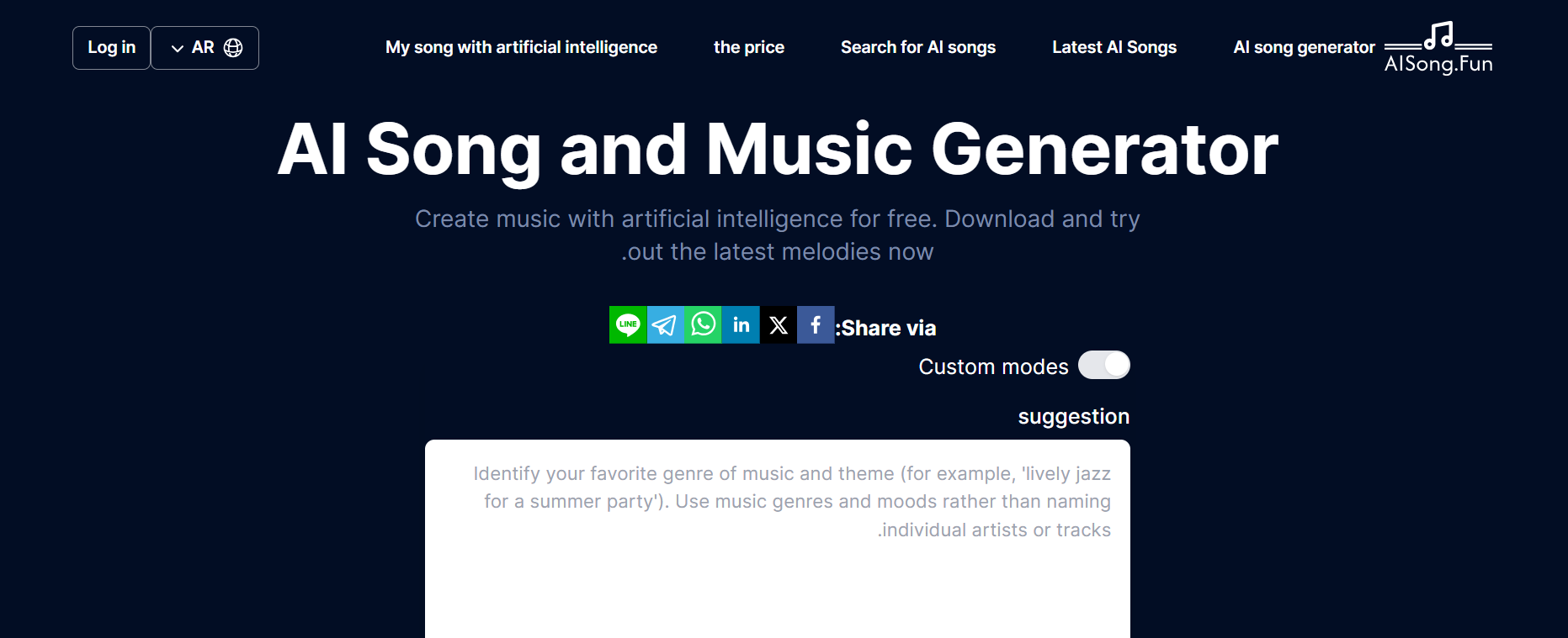 Create music effortlessly with AISong.Fun, an advanced AI-powered platform that lets you generate songs in various styles and moods. Whether you’re an aspiring artist, a content creator, or just experimenting with AI-generated melodies, our platform helps you compose and download high-quality AI songs instantly. Explore custom modes, personalize lyrics, and produce unique tracks—all in just a few clicks!