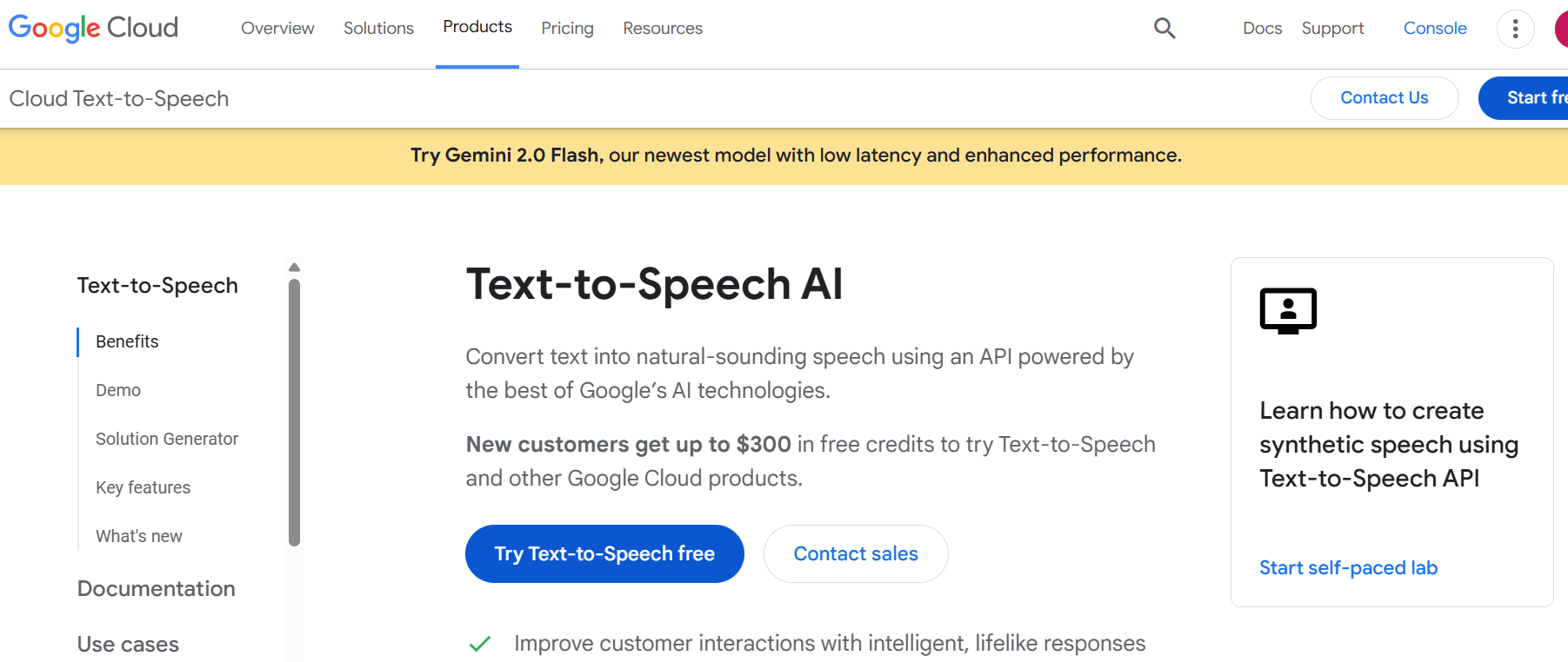 Convert text into natural-sounding speech with Google Cloud’s Text-to-Speech API, powered by advanced AI technologies. Enhance user experiences with lifelike voices, customizable speech parameters, and a vast selection of languages and voices. Whether you’re building voicebots, generating audio for content, or improving accessibility, this API delivers high-quality, responsive voice interactions.