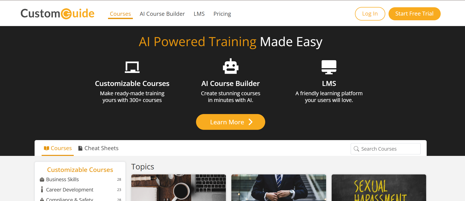 CustomGuide offers an all-in-one training solution that simplifies course creation and learning management. With 300+ customizable courses and an AI-powered course builder, you can design engaging training programs in minutes. Our user-friendly LMS ensures seamless learning experiences for individuals and organizations alike. Whether you need business skills, compliance training, or tech tutorials, CustomGuide has you covered. Trusted by over 3,000 organizations, our courses save time and deliver high-quality education.