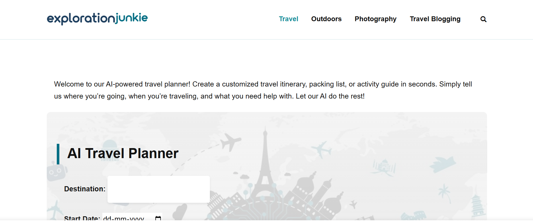 Plan your perfect trip effortlessly with Exploration Junkie’s AI-powered travel planner. Whether you need a custom itinerary, a packing list, or personalized activity suggestions, our AI takes the guesswork out of travel planning. Just enter your destination, travel dates, and preferences—let AI do the rest!
