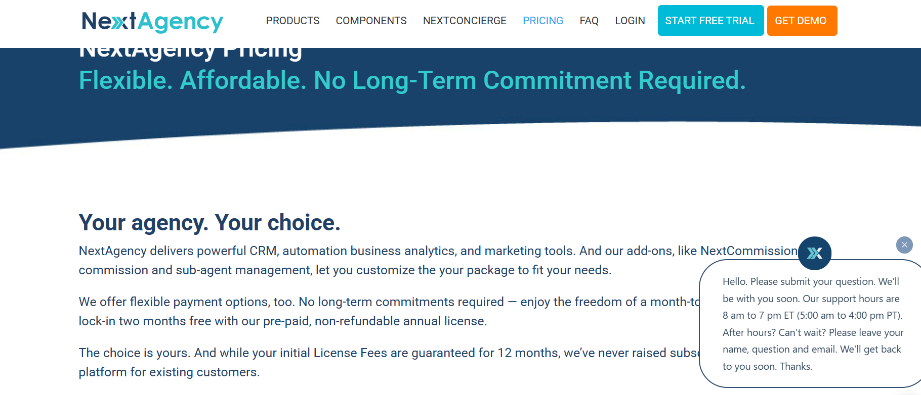 With flexible payment options, you can choose a month-to-month subscription or save two months with an annual prepaid license. Your initial license fees are locked in for 12 months, and NextAgency has never increased core platform subscription rates for existing customers.