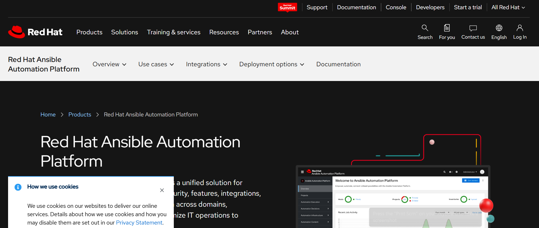 Red Hat® Ansible® Automation Platform is a unified solution designed to scale automation across domains, orchestrate essential workflows, and optimize IT operations. With robust security, extensive integrations, and flexible deployment options, it empowers organizations to maximize efficiency, improve security, and lay the foundation for enterprise AI adoption. Whether you’re automating infrastructure, enhancing security, or managing hybrid cloud environments, Ansible Automation Platform delivers the tools to transform your IT operations.