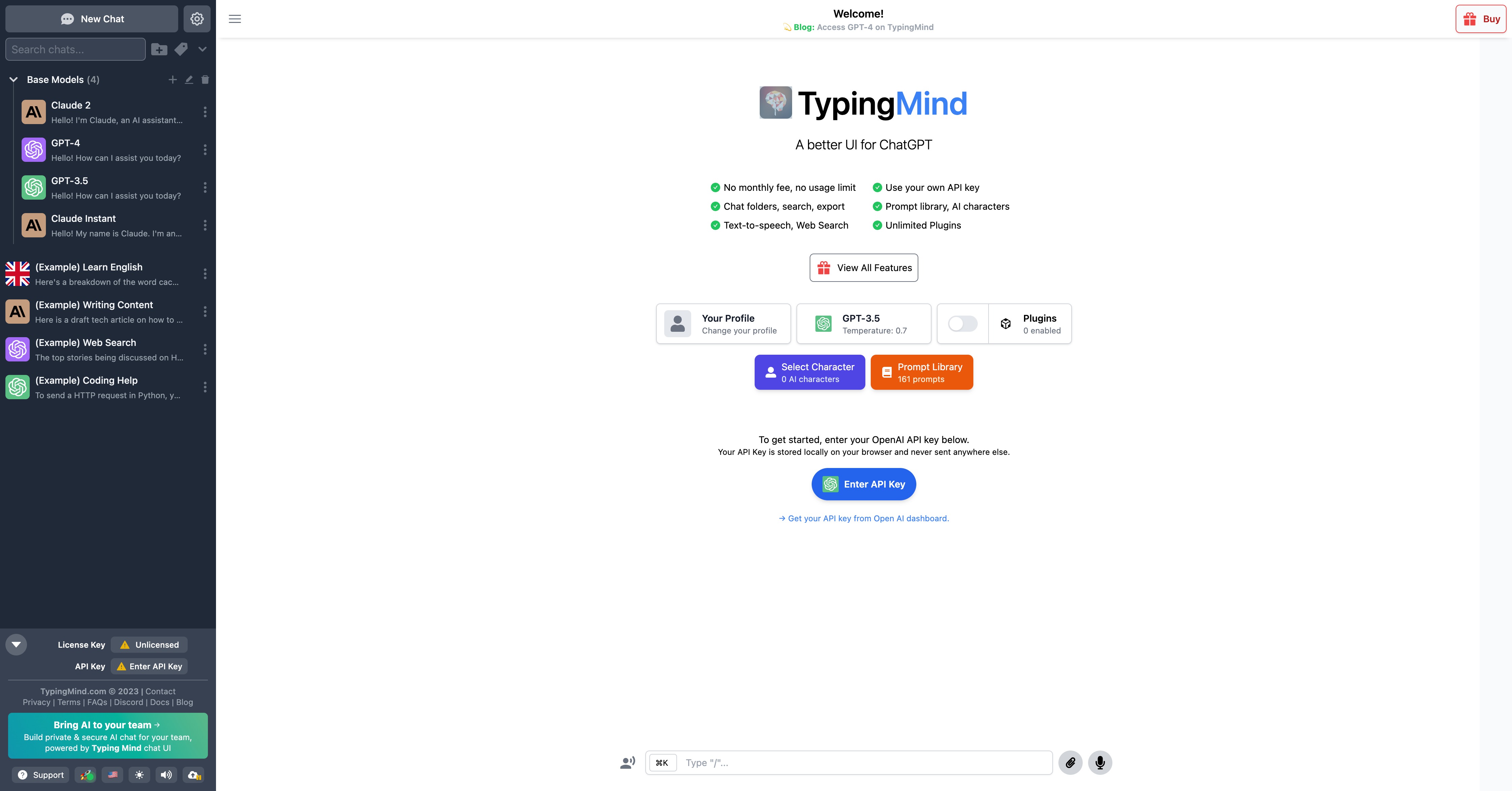 Introducing TypingMind, an advanced AI tool meticulously designed to elevate the performance of ChatGPT. With TypingMind, users can experience faster response times, integrated research tools, and a vast prompt library, setting it apart from other chatbots in the market. What makes TypingMind truly unique is its ability to run software locally, ensuring the utmost privacy and security without the need for login credentials. By leveraging TypingMind, users gain access to their search history and unlock enhanced conversation effectiveness. To get started with TypingMind, simply enter your OpenAI API key, enabling seamless connectivity to the powerful GPT-3.5-turbo model. Whether you’re a business professional or an individual seeking cutting-edge AI solutions, TypingMind is the ultimate choice for unlocking powerful AI capabilities.
