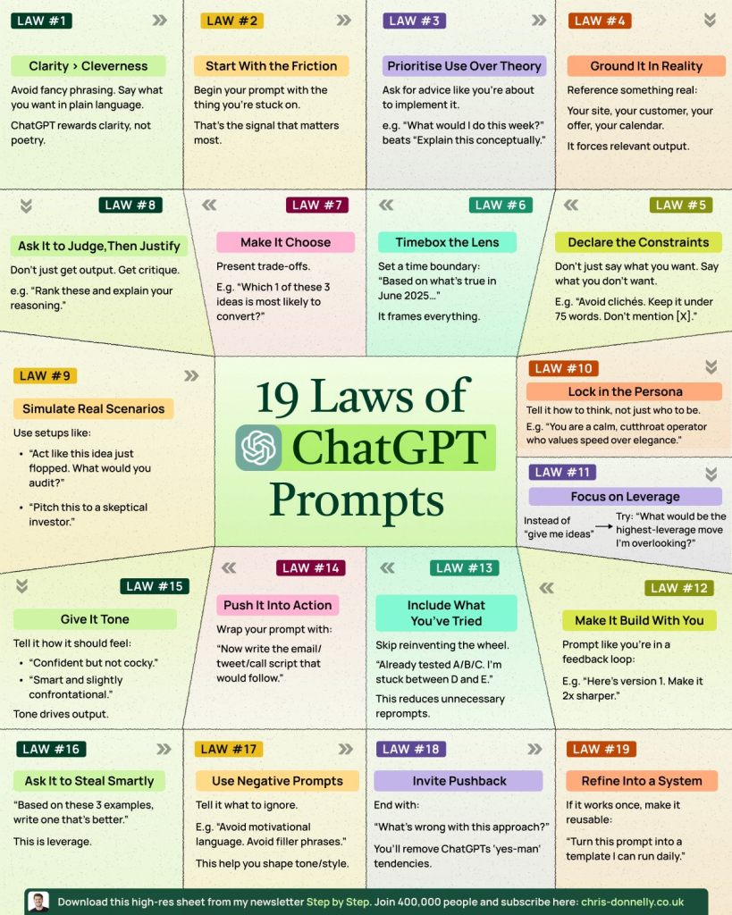 ChatGPT isn’t a brain—it’s a mirror. These 19 prompt laws won’t give you strategy, but they’ll ensure you squeeze every drop of value from your AI assistant.
